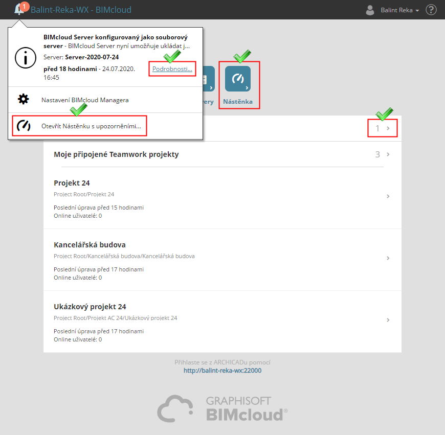 na notifikační nástěnce (samostatná stránka BIMcloud Manageru)