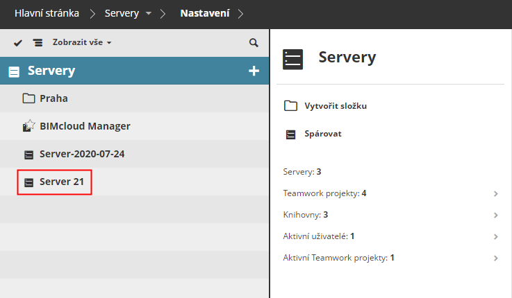 BIMcloud Server se automaticky objeví v Navigátoru BIMcloud Manageru.