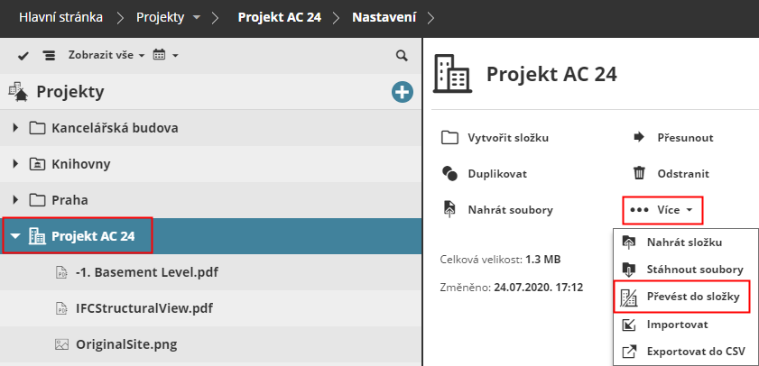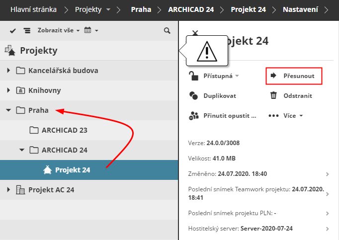 Klikněte na Přesunout a vyberte cílovou složku: buď kořenovou složku projektů, nebo některou ze složek na první úrovni.