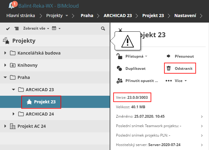 Nyní musíte z BIMcloud Managera odstranit všechny nekompatibilní projekty - tedy projekty nasdílené z jiné verze Archicadu: