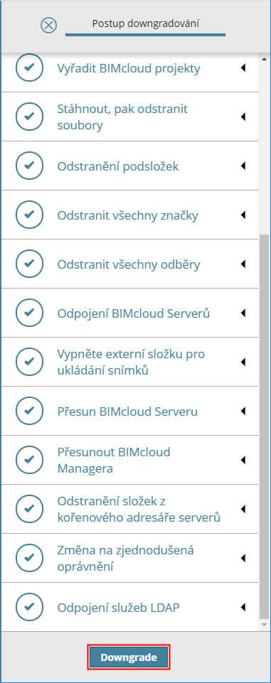 Na stránce serverů označte BIMcloud Manager (nebo klikněte na Zkontrolovat v Průvodci downgradu, stránka se otevře).