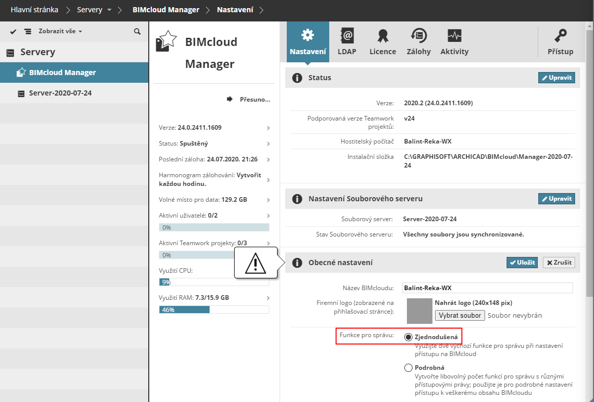 Pokud se vás jednotlivé kroky týkají, budou označeny červeným výstražným trojúhelníkem a automaticky budete přesměrováni na příslušnou stránku BIMcloud Manageru, kde můžete upravit nastavení dle požadavků.