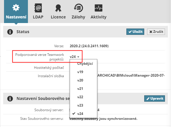 V sekci Podporovaná verze Teamwork projektů: Vyberte jedinou verzi Archicadu, která bude podporována.