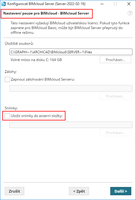 Možnost ukládat snímky do externí složky není v BIMcloudu Basic dostupná.