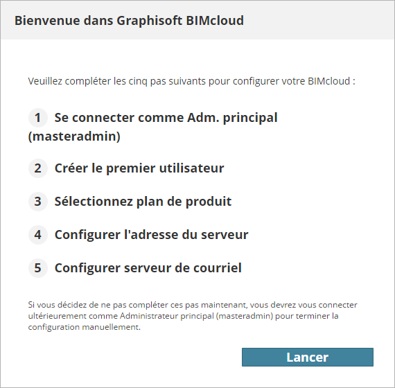 La fenêtre de votre navigateur s'ouvrira pour afficher les cinq étapes nécessaires à l'achèvement de l'installation de BIMcloud. (Si votre navigateur ne s'ouvre pas automatiquement, utilisez l'URL suivant : http://localhost:PORT, où PORT est le port que vous avez saisi dans cette page de configuration)