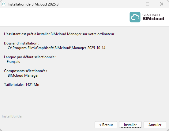 - Une fenêtre s'affichera pour vous montrer où le BIMcloud Manager sera installé. Cliquez sur Installer pour lancer le processus.