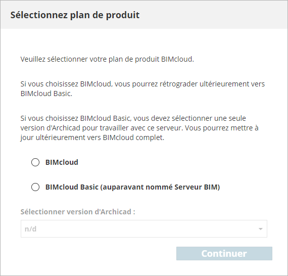 - Sélectionnez un plan de produit : BIMcloud complet ou BIMcloud Basic.