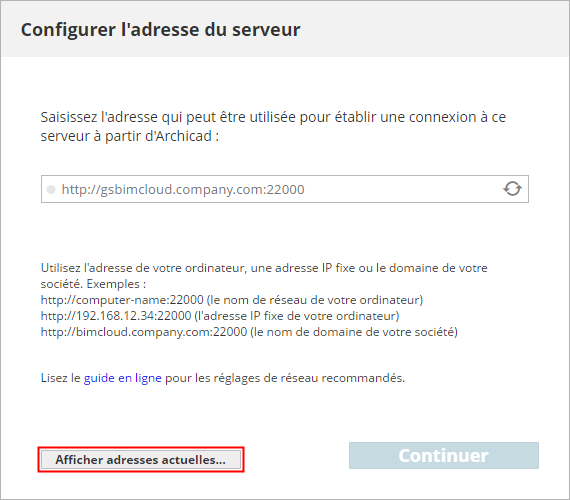 - Vous pouvez modifier cette adresse ultérieurement dans le volet Réglages du BIMcloud Manager.