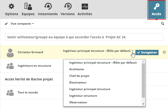 Quand vous accordez l'accès à un utilisateur dans le volet Accès, il apporte ce rôle par défaut, à moins que vous ne lui attribuiez un rôle différent.