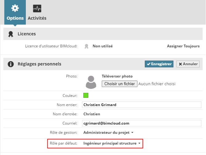 Chaque utilisateur peut posséder un rôle par défaut défini dans ses Options Utilisateur. (Le rôle par défaut est optionnel.)
