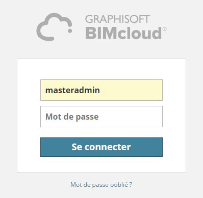 Le nom de connexion pour l'Administrateur principal est masteradmin. Le mot de passe a été défini lors de l'installation du serveur dans l'interface du BIMcloud Manager. Si vous avez oublié ce mot de passe, lancez de nouveau la configuration du BIMcloud Manager et définissez un nouveau mot de passe.