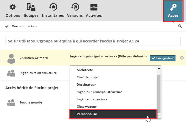 Parfois il est plus simple d'accorder certains droits d'accès localement à quelqu'un pour un élément de contenu donné sans enregistrer ce jeu de droits comme un nouveau rôle générique. Dans ce cas, en accordant l'accès, sélectionnez Personnalisé dans la liste déroulante et cliquez sur Enregistrer.