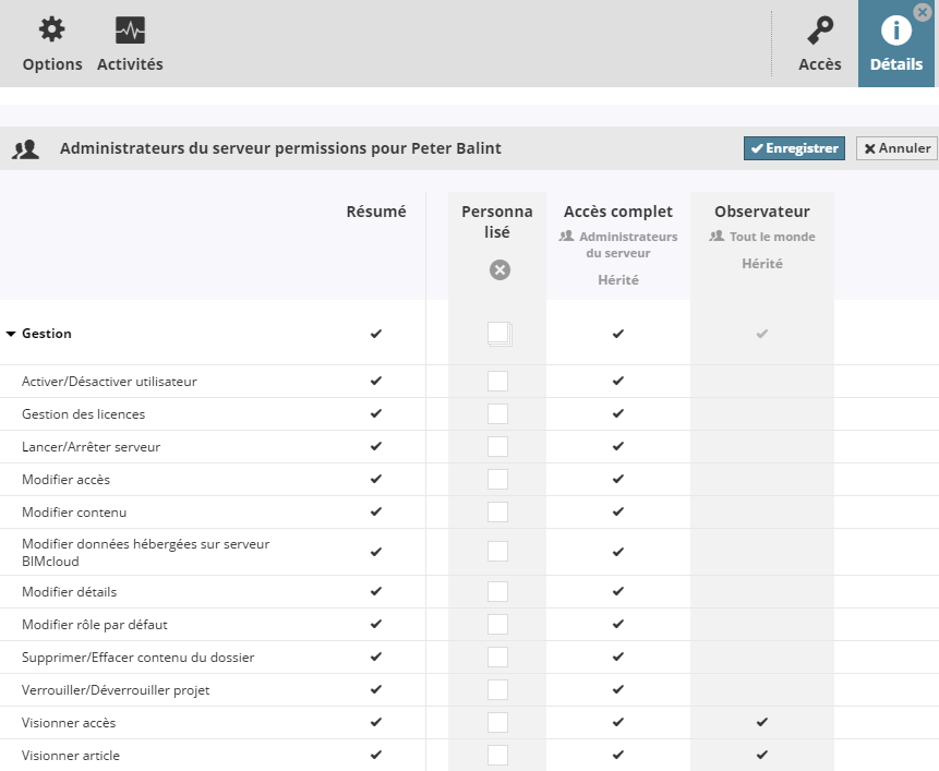 La page Détails s'ouvrira automatiquement et vous pourrez alors sélectionner les droits nécessaires comme faisant partie d'un rôle personnalisé de l'utilisateur ou du groupe sélectionné (voir ci-dessous).