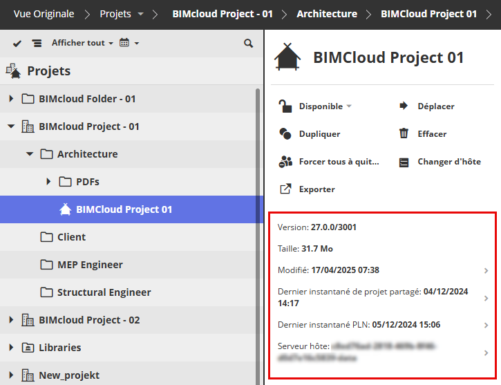 Cliquez sur un article pour naviguer à la page appropriée du BIMcloud Manager (par exemple, cliquez sur l'article Serveur hôte pour ouvrir la page Serveurs).