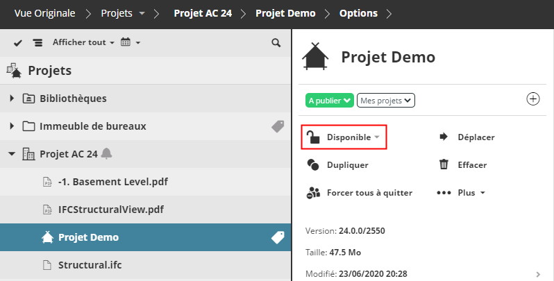 Dans la page Projets de BIMcloud, l'état du projet sélectionné vous indique