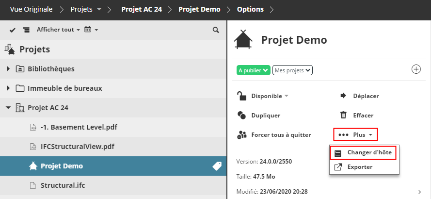 Utilisez Changer d'hôte pour déplacer les données d'un Projet ou Bibliothèque Teamwork d'un serveur hôte à un autre sur le BIMcloud.
