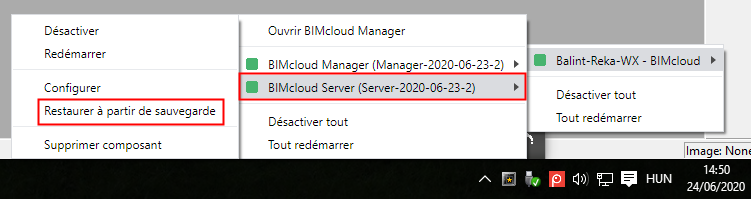 Cliquez sur le nom du composant dont vous souhaitez rétablir les données : BIMcloud Server ou BIMcloud Manager.