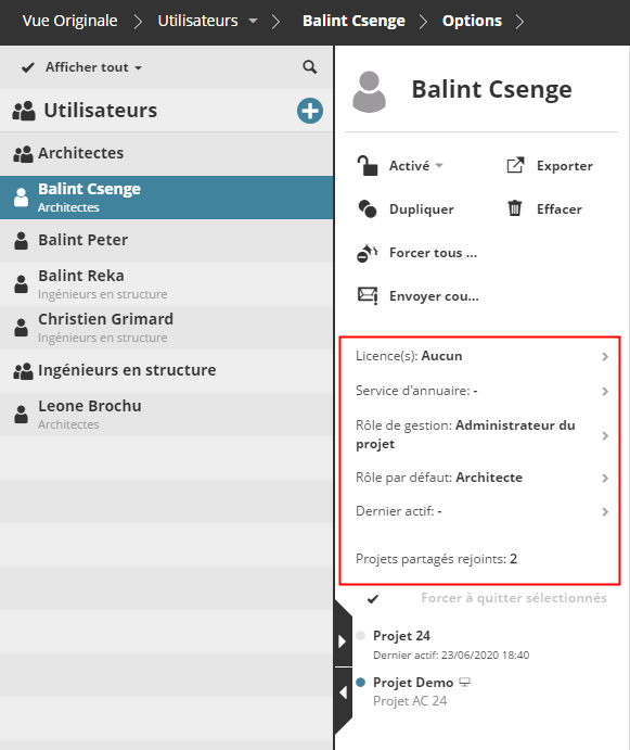 Indique si l'utilisateur possède ou non une licence d'utilisateur BIMcloud. |