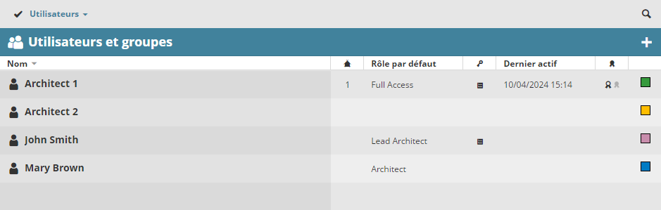 Le Navigateur de la page Utilisateurs et groupes répertorie la liste des utilisateurs et des groupes d'utilisateurs.