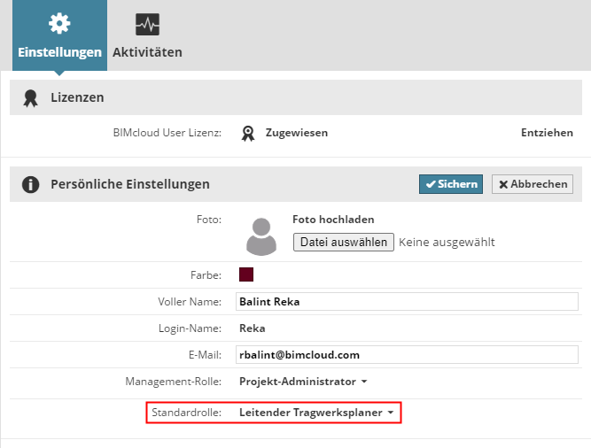 Für jeden Nutzer kann in seinen Nutzereinstellungen eine Standardrolle definiert sein. (Eine Standardrolle ist optional.)
