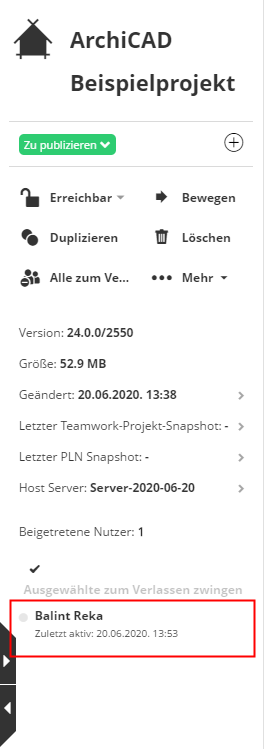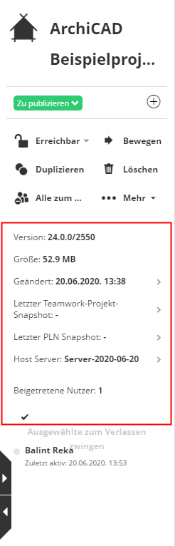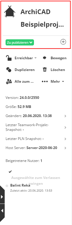 Jedes Element im BIMcloud-Manager auswählen: In der Zusammenfassung werden Kurzinfos und verwandte Funktionen angezeigt.