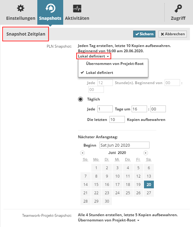 Standardmäßig übernehmen alle Teamwork-Projekte und -Bibliotheken den Snapshot-Zeitplan ihres übergeordneten Ordners.