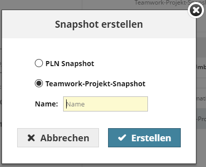 Für ein Projekt: Wählen Sie die Art des gewünschten Snapshots (PLN- oder Teamwork-Projekt) und geben Sie ihm einen Namen.