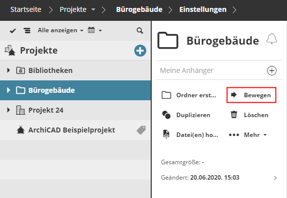 Die Funktion Bewegen ist auf der Projekt-Seite BIMcloud für alle Elemente außer Projekt-Root verfügbar.