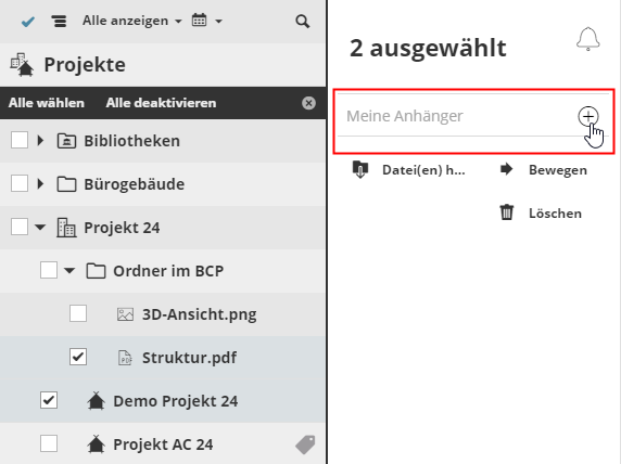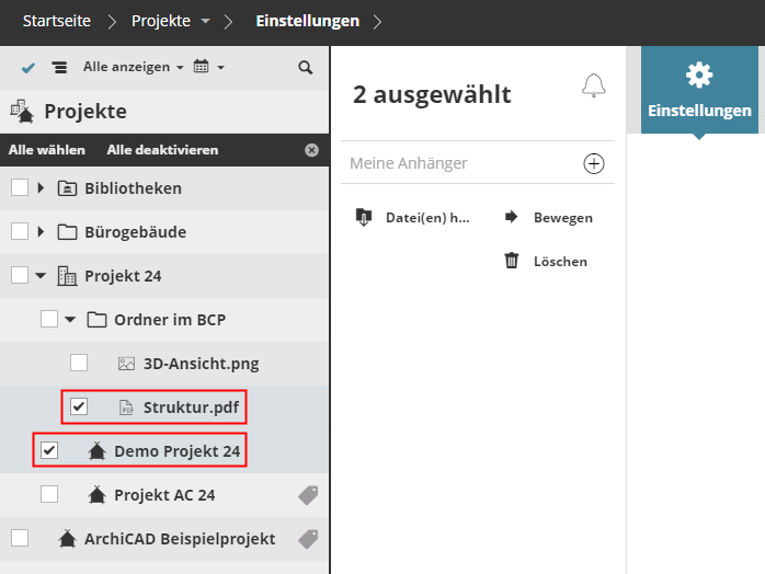 Etikettenfähige Elemente sind alle, die auf der BIMcloud-Projektseite aufgelistet sind: Teamwork-Projekte, BIMcloud-Projekte, Bibliotheken, Ordner und hochgeladene Dateien.