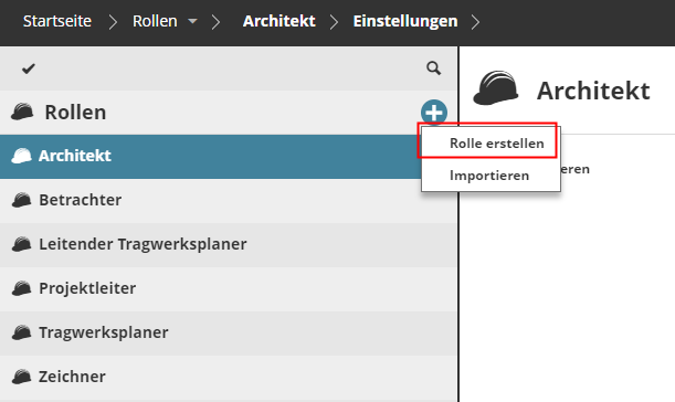 Klicken Sie auf Rolle erstellen über das Pluszeichen neben dem Rolle-Root oder über die Root-Zusammenfassung. Geben Sie einen Rollennamen ein.