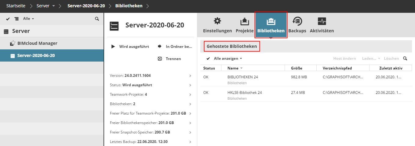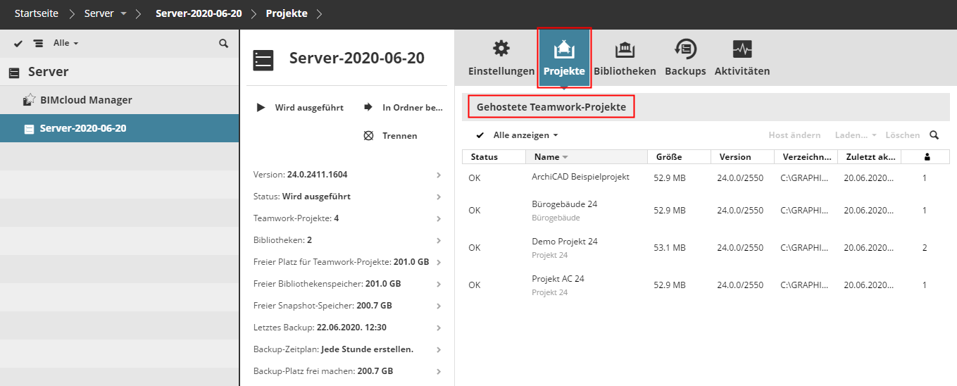 BIMcloud Manager und BIMcloud Server sind separate Komponenten. Ein im BIMcloud Manager aufgelistetes Projekt bzw. eine Bibliothek muss auch verknüpfte Projekt- bzw. Bibliotheksdaten auf dem Server haben. Die auf dem Server vorliegenden Daten müssen mit einem Projekt bzw. einer Bibliothek im BIMcloud Manager verknüpft sein.