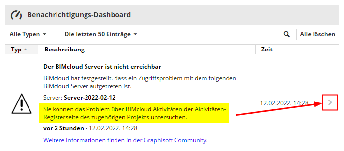 Die Benachrichtigungen sind so konzipiert, dass sie kontextsensitiv sind. Dadurch können Sie einfach zu der richtigen Seite des BIMcloud Managers oder anderen Ressourcen navigieren, damit Sie das Problem anschauen und/oder korrigieren können.