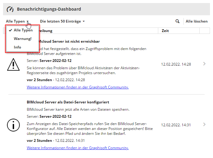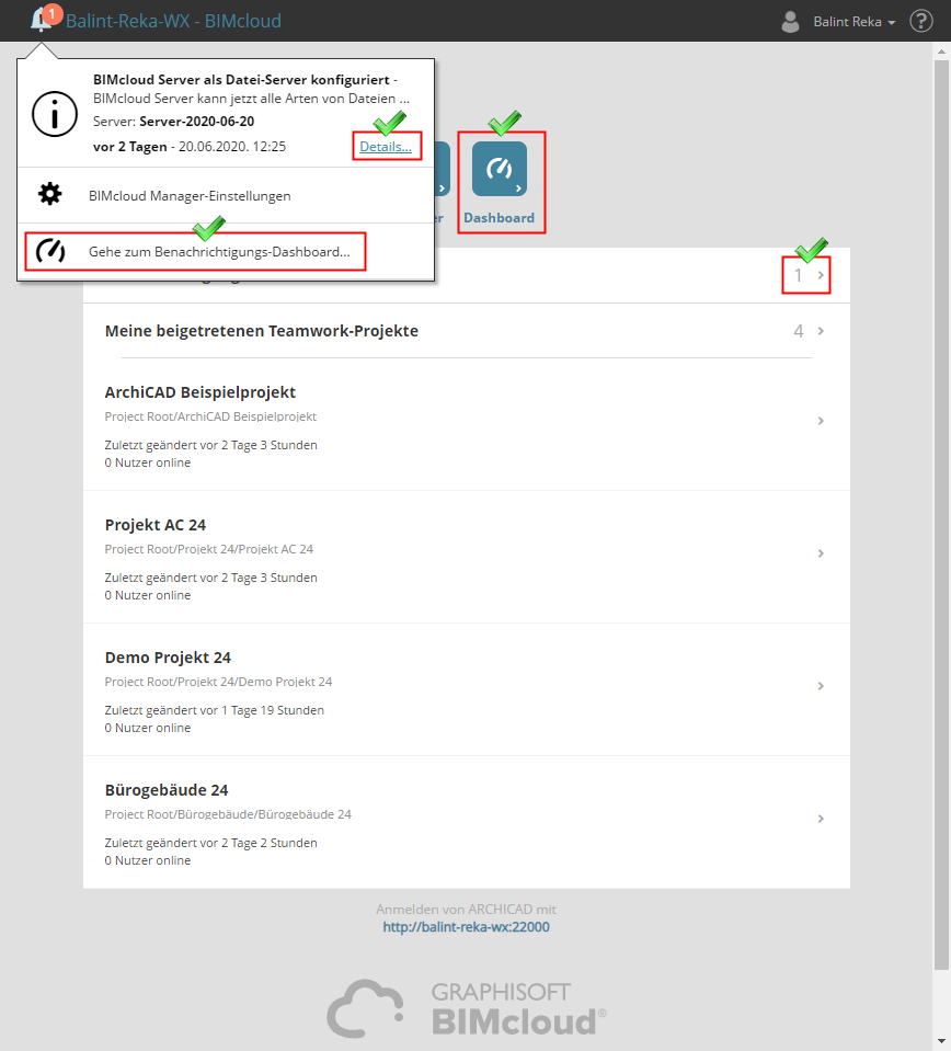 im Benachrichtigungs-Dashboard (eine separate Seite des BIMcloud Managers)