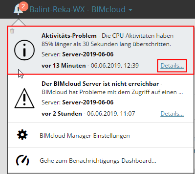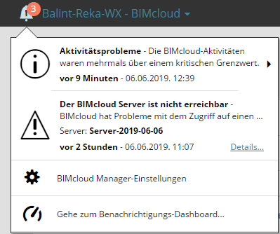 im Benachrichtigungen Dropdown-Feld (Glocken-Symbol) auf jeder Seite des BIMcloud Managers