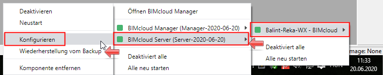 Zur Überprüfung dieser Pfade suchen Sie zunächst das Tray-Symbol des BIMcloud Servers. Klicken Sie mit der rechten Maustaste, suchen Sie die gewünschte Komponente und klicken Sie in den verfügbaren Befehlen auf Konfigurieren.