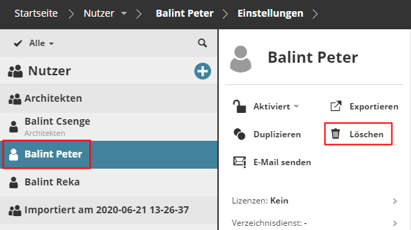 Wählen Sie einen oder mehrere Nutzer oder Nutzergruppen zum Löschen aus. Bestätigen Sie den Löschprozess in dem eingeblendeten Dialogfenster.