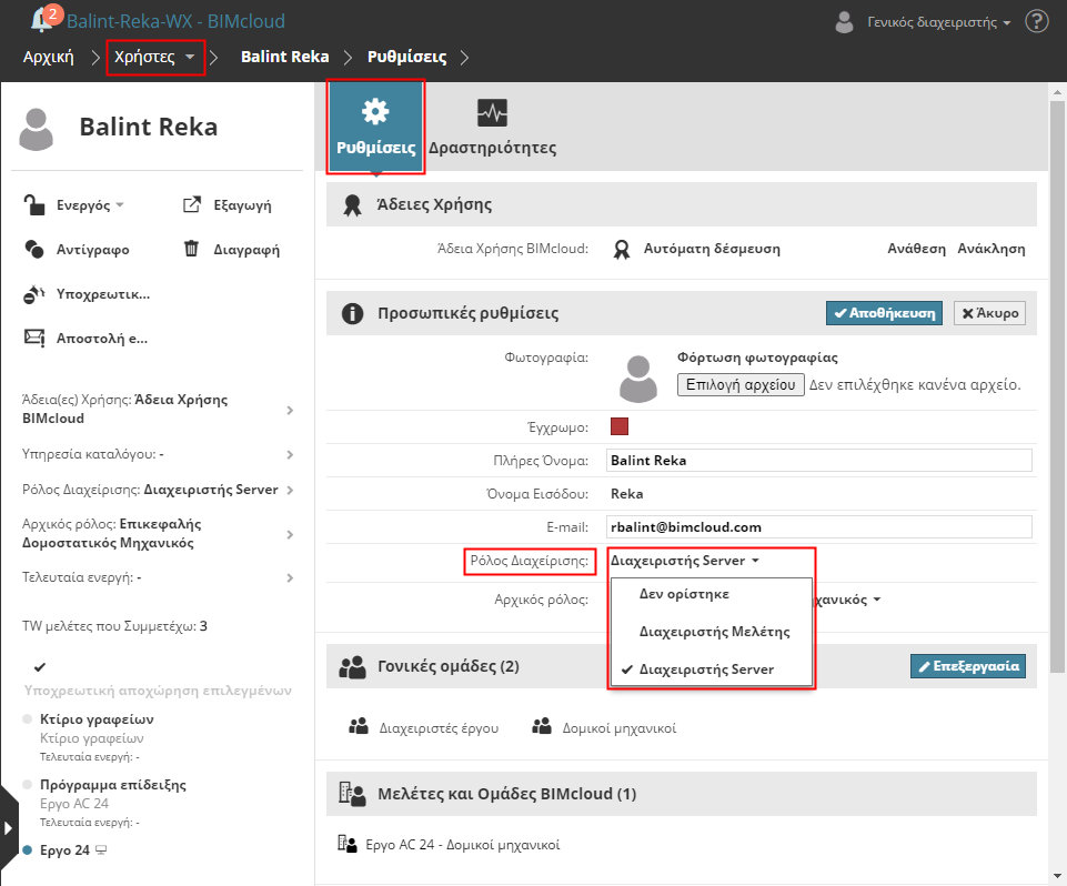 Στην απλοποιημένη μέθοδο δικαιωμάτων, μπορείτε να αναθέσετε σε χρήστες έναν από τους τρεις ρόλους διαχείρισης: Διαχειριστής Μελέτης, Διαχειριστής Server ή Δεν ορίστηκε.