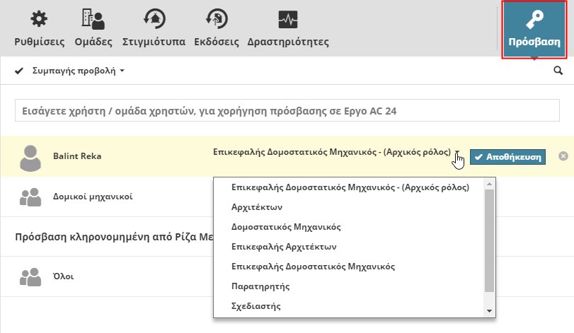 Εάν σε μία ομάδα χορηγείται πρόσβαση με τον προκαθορισμένο ρόλο της, τότε κάθε μέλος της ομάδας έχει επίσης τον δικό του προκαθορισμένο ρόλο.