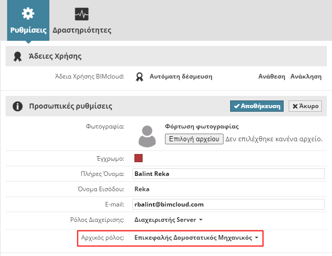 Κάθε χρήστης μπορεί να έχει έναν αρχικό ρόλο που ορίστηκε στις ρυθμίσεις χρήστη. (Ένας αρχικός ρόλος είναι προαιρετικός).