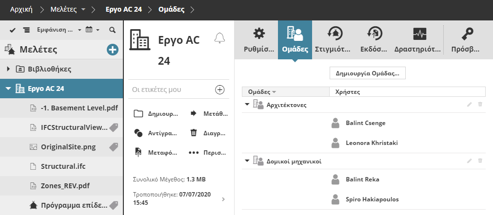 Οι λειτουργίες μίας Μελέτης BIMcloud, ως ένας ειδικός τύπος φακέλου. Για παράδειγμα, η δική σας Μελέτη BIMcloud μπορεί να περιλαμβάνει TW Μελέτες, αρχεία οποιασδήποτε μορφής και υπο-φακέλους σε οποιαδήποτε ιεραρχία. Μπορείτε να αναθέσετε έναν μοναδικό Κλάδο χρηστών στη δική σας Μελέτη BIMcloud και/ή στα επιμέρους στοιχεία της.