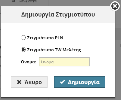 Για μία Μελέτη: Επιλέξτε τον τύπο στιγμιότυπου που θέλετε (PLN ή TW Μελέτης) και δώστε του ένα όνομα.