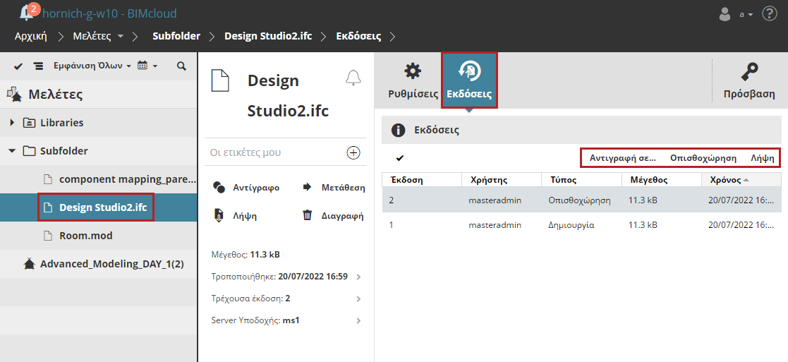 Απομνημόνευση και ανάκτηση προηγούμενων εκδόσεων αρχείων στο BIMcloud