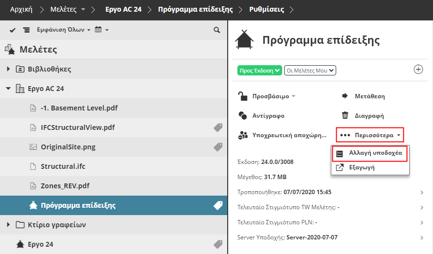 Χρησιμοποιήστε την Αλλαγή Υποδοχέα για να μετακινήσετε δεδομένα μίας TW Μελέτης ή Βιβλιοθήκης από έναν server υποδοχής σε έναν άλλον, στον BIMcloud.