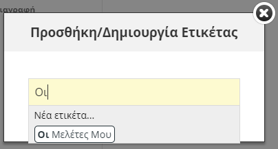 Αρχίστε να πληκτρολογείτε το όνομα μίας υπάρχουσας ετικέτας (π.χ. «Οι Μελέτες μου") μέχρι να εμφανιστεί η επιθυμητή ετικέτα στην παρακάτω λίστα. Κάντε κλικ για να ανατεθεί.