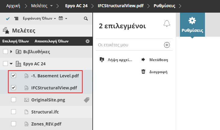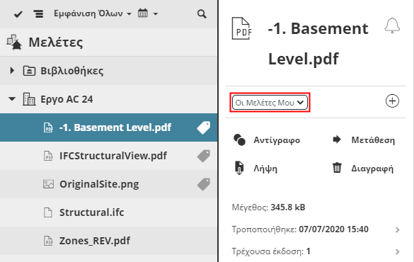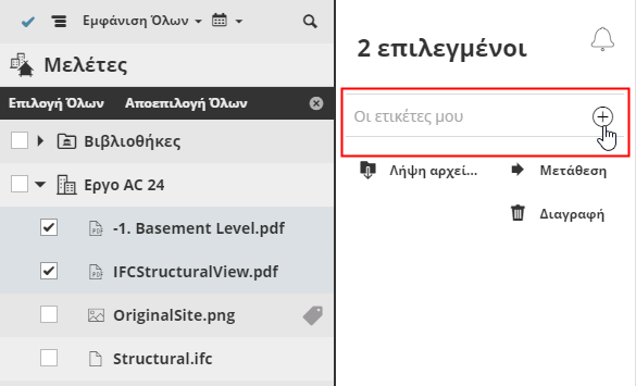 Τα στοιχεία που μπορούν να επισημανθούν είναι όλα εκείνα που αναφέρονται στη σελίδα Μελέτες του BIMcloud: TW Μελέτες, Μελέτες BIMcloud, Βιβλιοθήκες, φάκελοι και μεταφορτωμένα αρχεία.