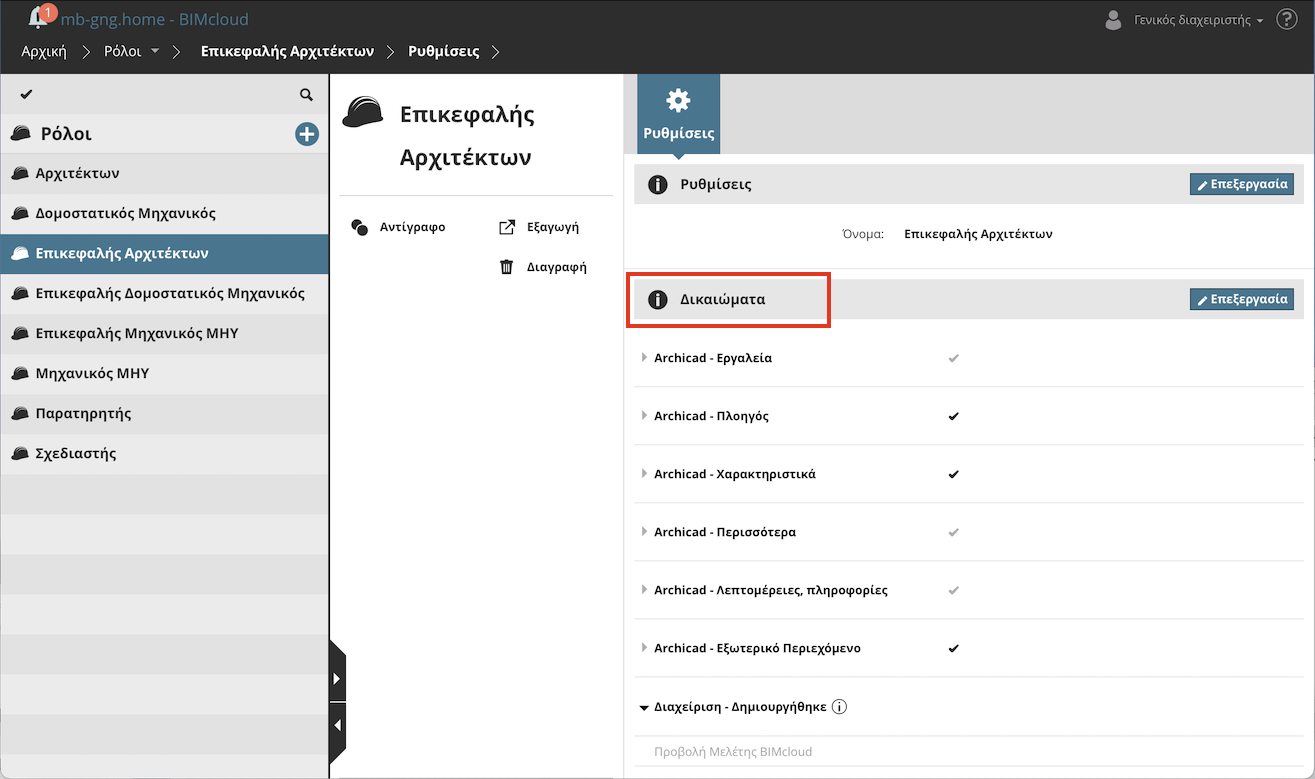 Μεταβείτε στη σελίδα Ρόλοι του BIMcloud Manager και επιλέξτε έναν ρόλο για να δείτε τα δικαιώματά του.
