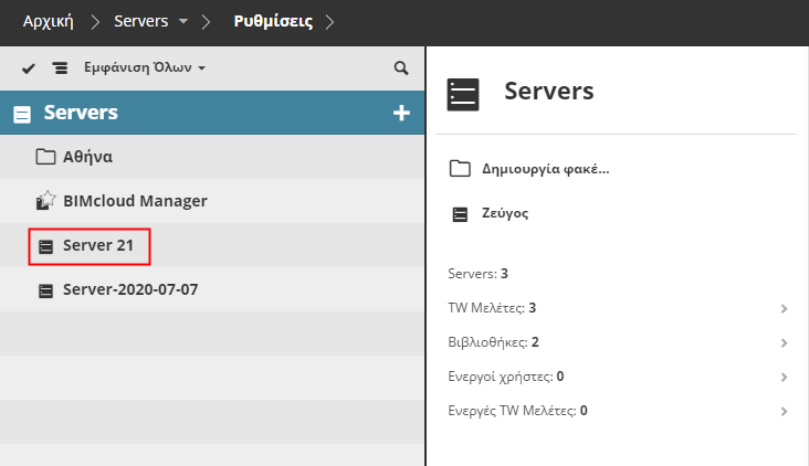 Ο BIMcloud Server θα εμφανιστεί αυτόματα στον Πλοηγό του BIMcloud Manager.