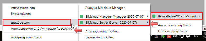 Για να ελέγξετε αυτές τις θέσεις, εντοπίστε το εικονίδιο του BIMcloud Server. Κάντε δεξί κλικ και στη συνέχεια βρείτε το συστατικό που χρειάζεστε και από τις διαθέσιμες εντολές πατήστε Διαμόρφωση.