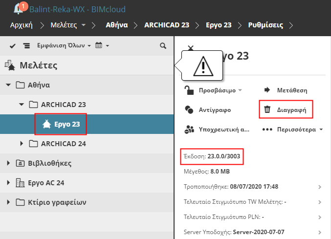 Στη συνέχεια πατήστε Διαγραφή για να τα αφαιρέσετε από τον BIMcloud Manager.