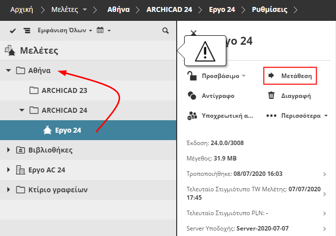 Εάν η σελίδα Μελέτες περιέχει οποιεσδήποτε BIMcloud Μελέτες, πρέπει να τις μετατρέψετε σε φακέλους τώρα. Τα περιεχόμενα θα παραμείνουν στον φάκελο, αλλά οι ορισμοί των Κλάδων των BIMcloud Μελετών θα εξαλειφθούν.